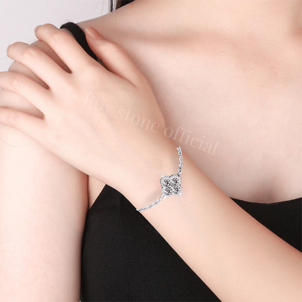 The Clover Moissanite Bracelet features D color grade stones with VVS1 clarity, offering radiant brilliance. The round cut enhances its shine, creating an elegant and timeless accessory.