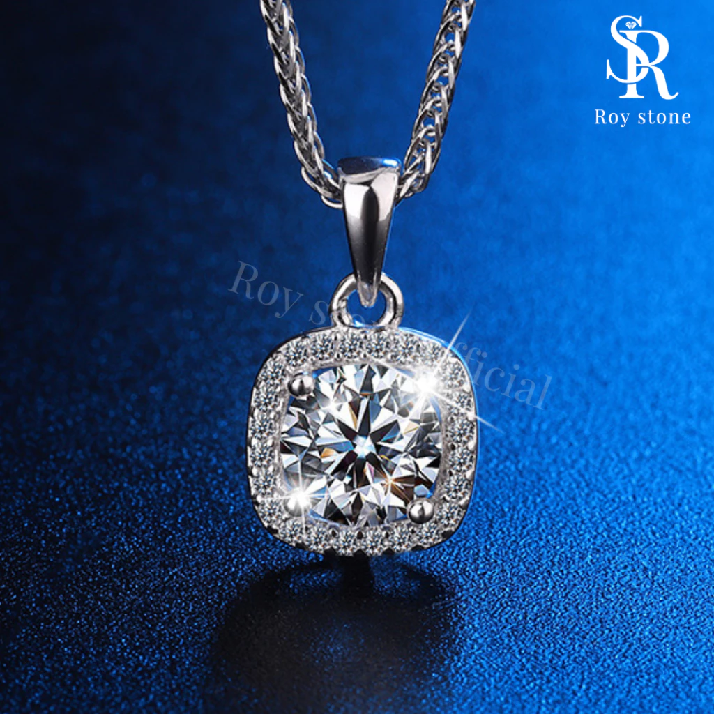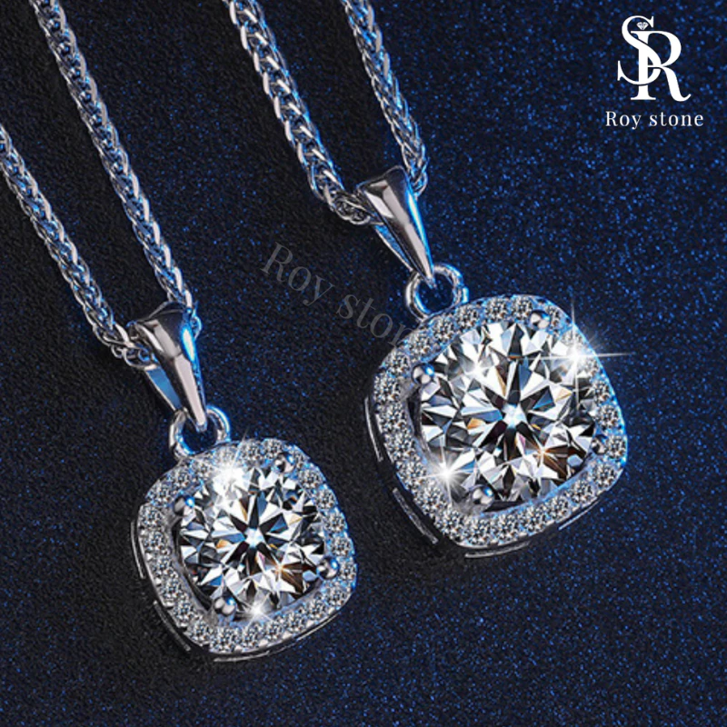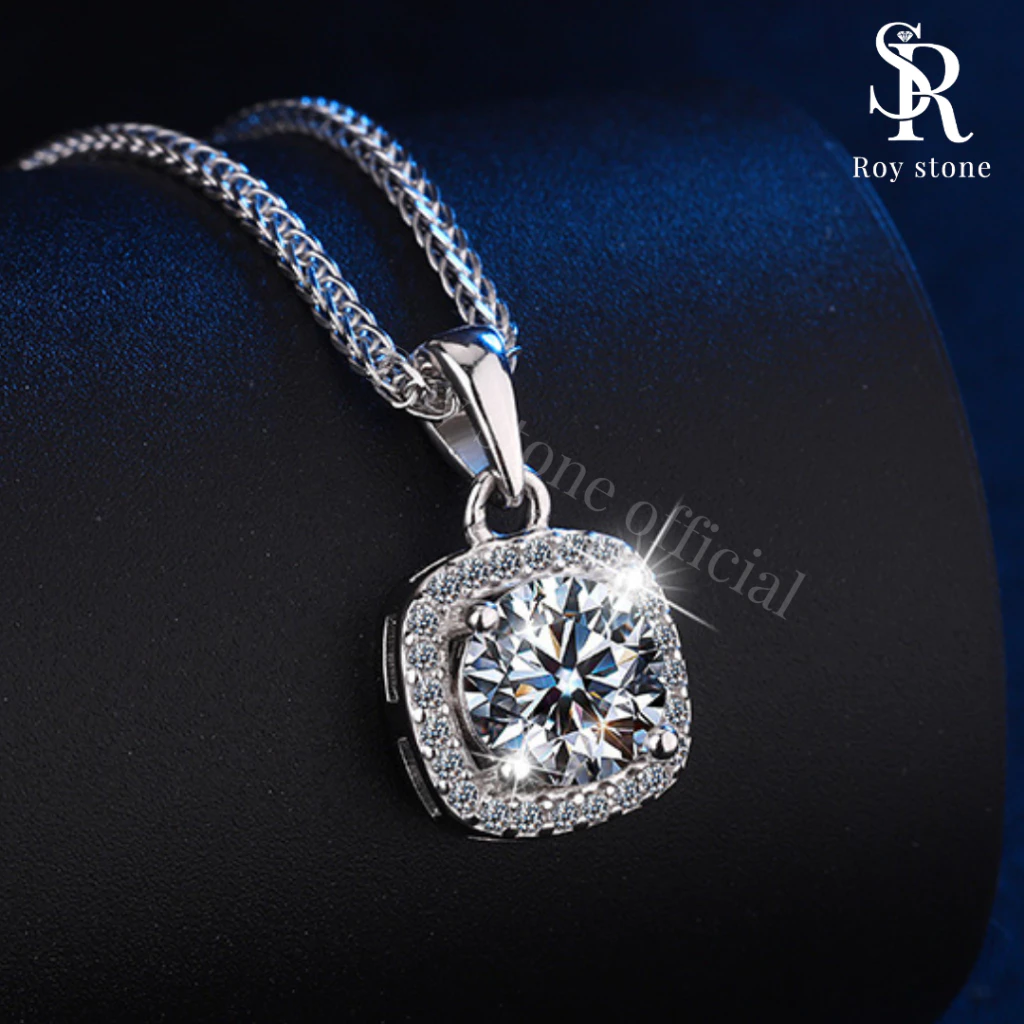 The Glam Square Moissanite Necklace offers a unique square cut design with D color grade and VVS1 clarity. The round cut ensures maximum brilliance, making it a bold and stunning choice for fashion-forward individuals.